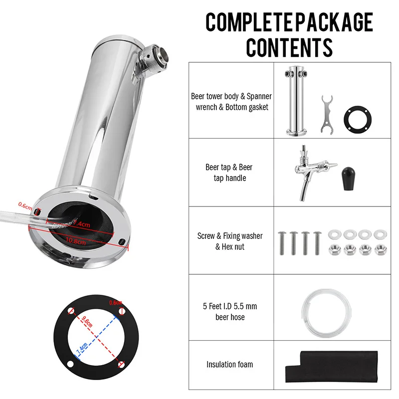 ◆ Full Set of Fittings: Except for the central beer tower, we are free to provide the other needed kegerator accessories, including faucets, beer tubes, faucet covers, insulation cotton, a set of wrench fasteners, etc. Meet all the needs of your installation.